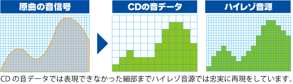 ハイレゾで再生された音源の感覚的には、よりリアルで実体感のある高音質になることです。ボーカルの息づかいや弦楽器のボウイングの有様などがもっと細かく判別できると言えばわかりやすいでしょうか。
